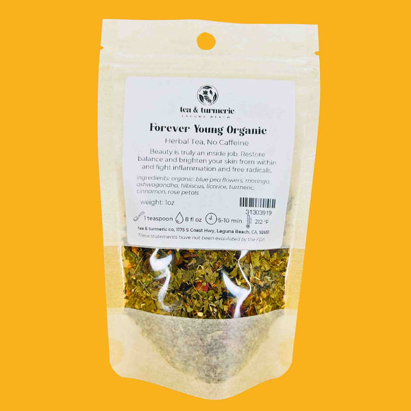 Ingredients: organic: blue pea flowers, moringa, ashwagandha, hibiscus, licorice, turmeric, cinnamon, rose petals