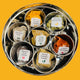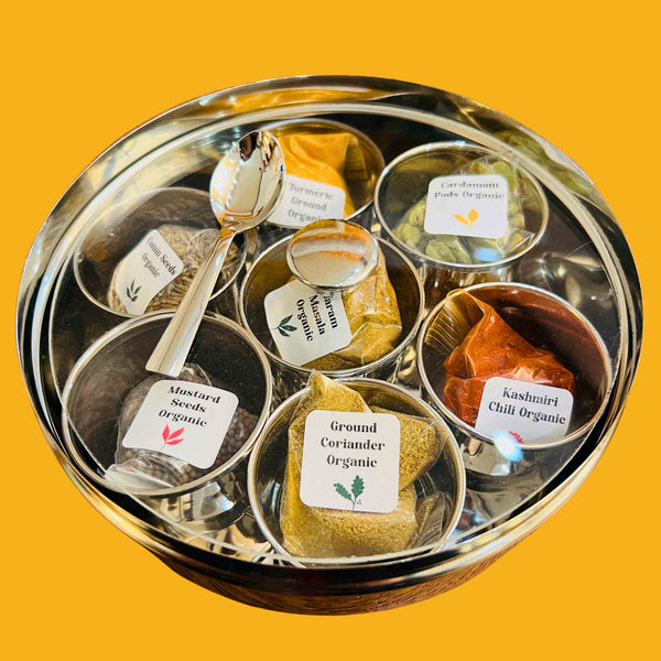 Bring the timeless flavors of India to your kitchen with the Rasa Dabba (The Essence of Flavor), a traditional stainless steel spice box filled with seven essential organic Indian spices: