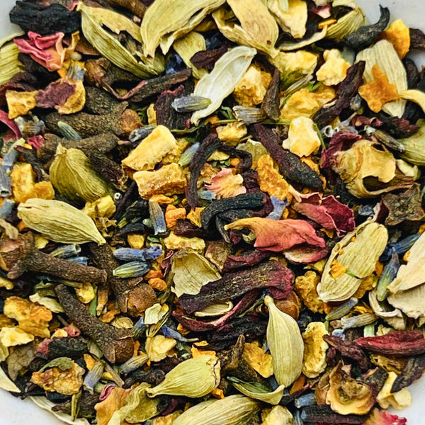 Ingredients:organic: cardamom, orange peel, turmeric, hibiscus, rose, cloves, lavender, stevia leaf