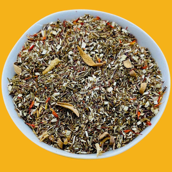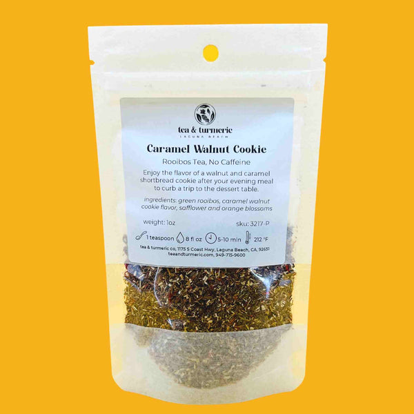 Ingredients: green rooibos, caramel walnut cookie flavor, safflower and orange blossoms