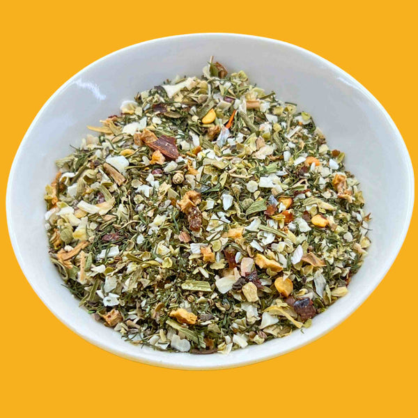 Ingredients: organic: onion, dill, tarragon, oregano, garlic, lemon zest, celery seed, chilies, black pepper. SALT FREE!
