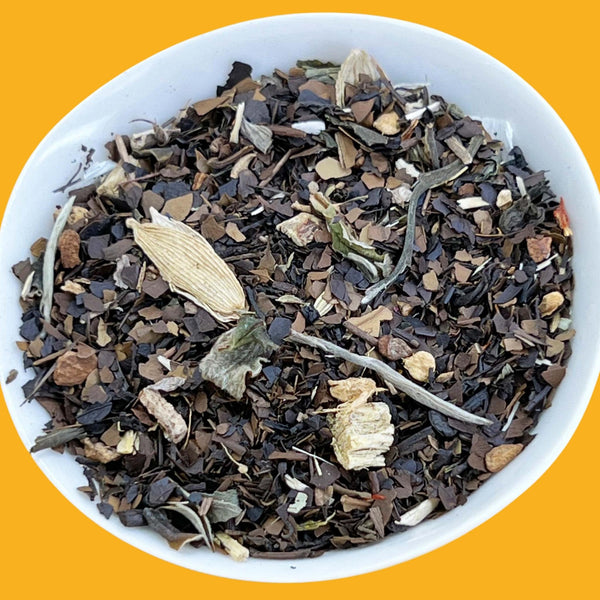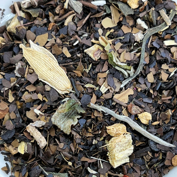 Ingredients: roasted yerba mate, black tea, green tea, white tea, pu'erh, ginger root, cinnamon, cardamom, licorice root, eleuthero ginseng root, saffron, black pepper, clove, fennel, safflowers, peppermint, tulsi, vanilla flavoring